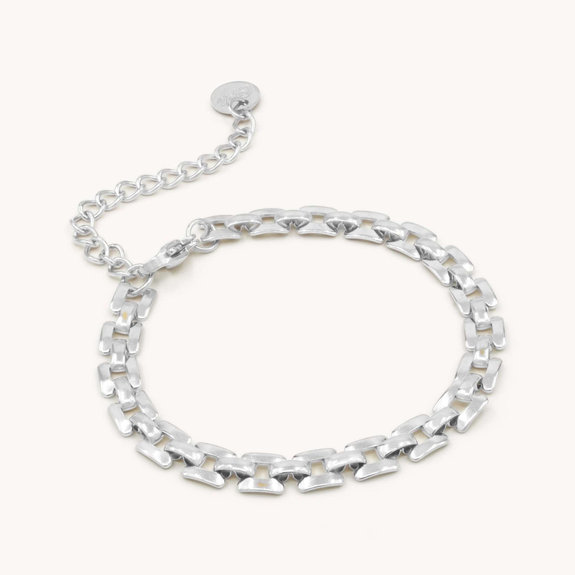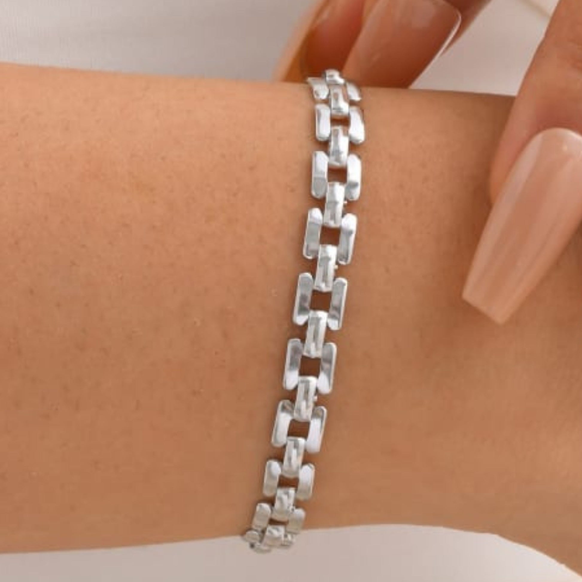 Bold and timeless, this structured silver link bracelet features a polished, watch-inspired design for a sleek, elevated finish. Perfect for layering or wearing solo as a statement piece.
