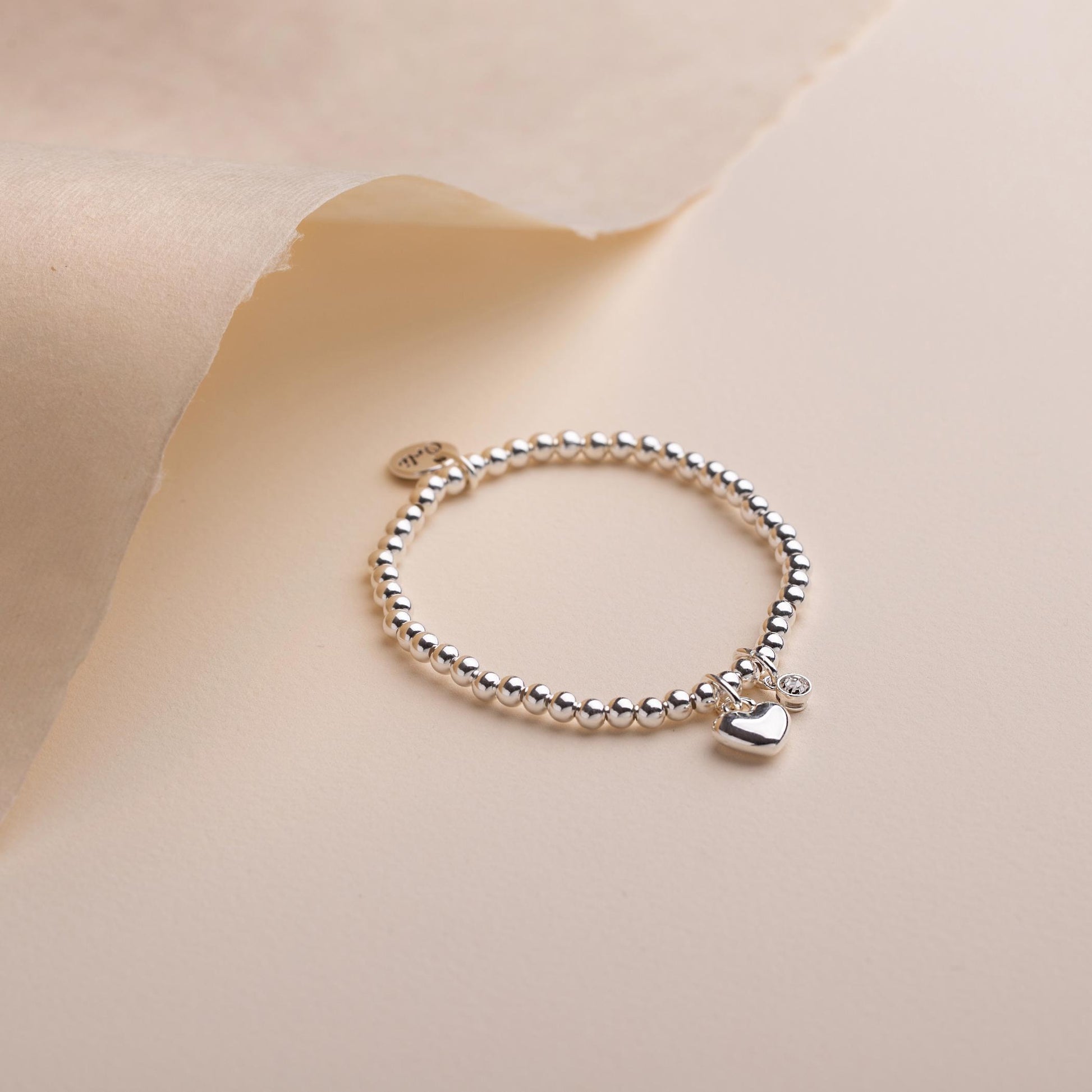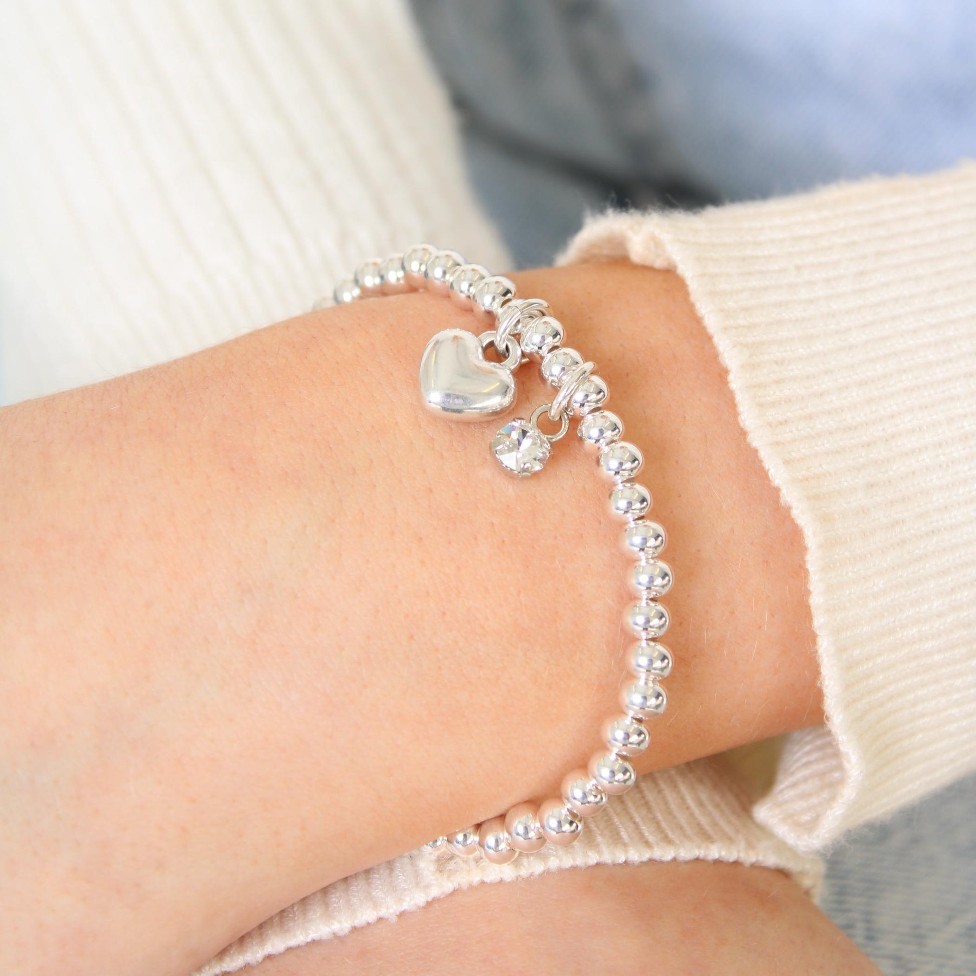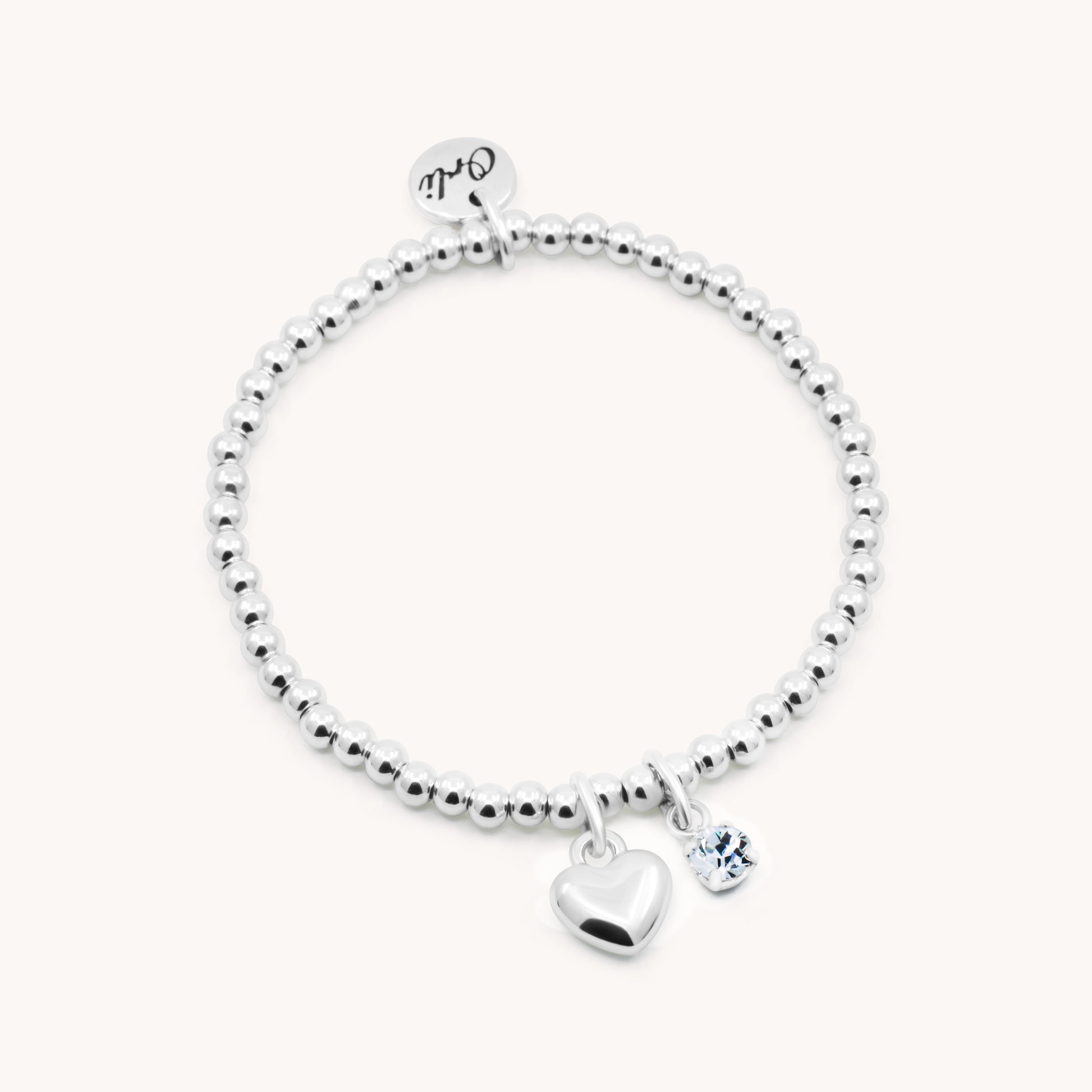 A sweet symbol of love and sparkle, this Puffed Heart & Birthstone Beads Bracelet is designed to be worn close to the heart. Featuring polished silver-plated beads, a crystal birthstone charm, and a puffed heart pendant, it’s the perfect keepsake to gift or treasure yourself.