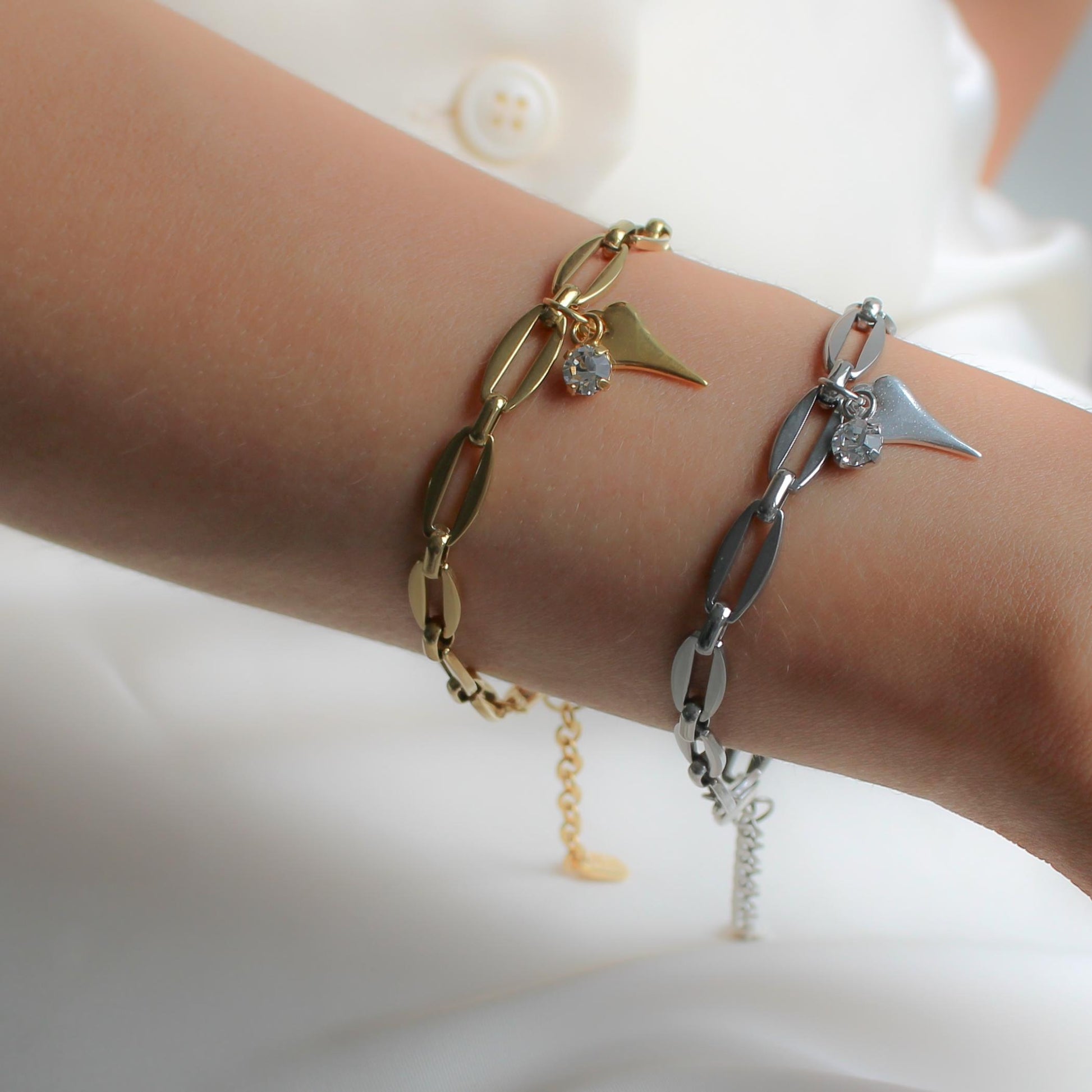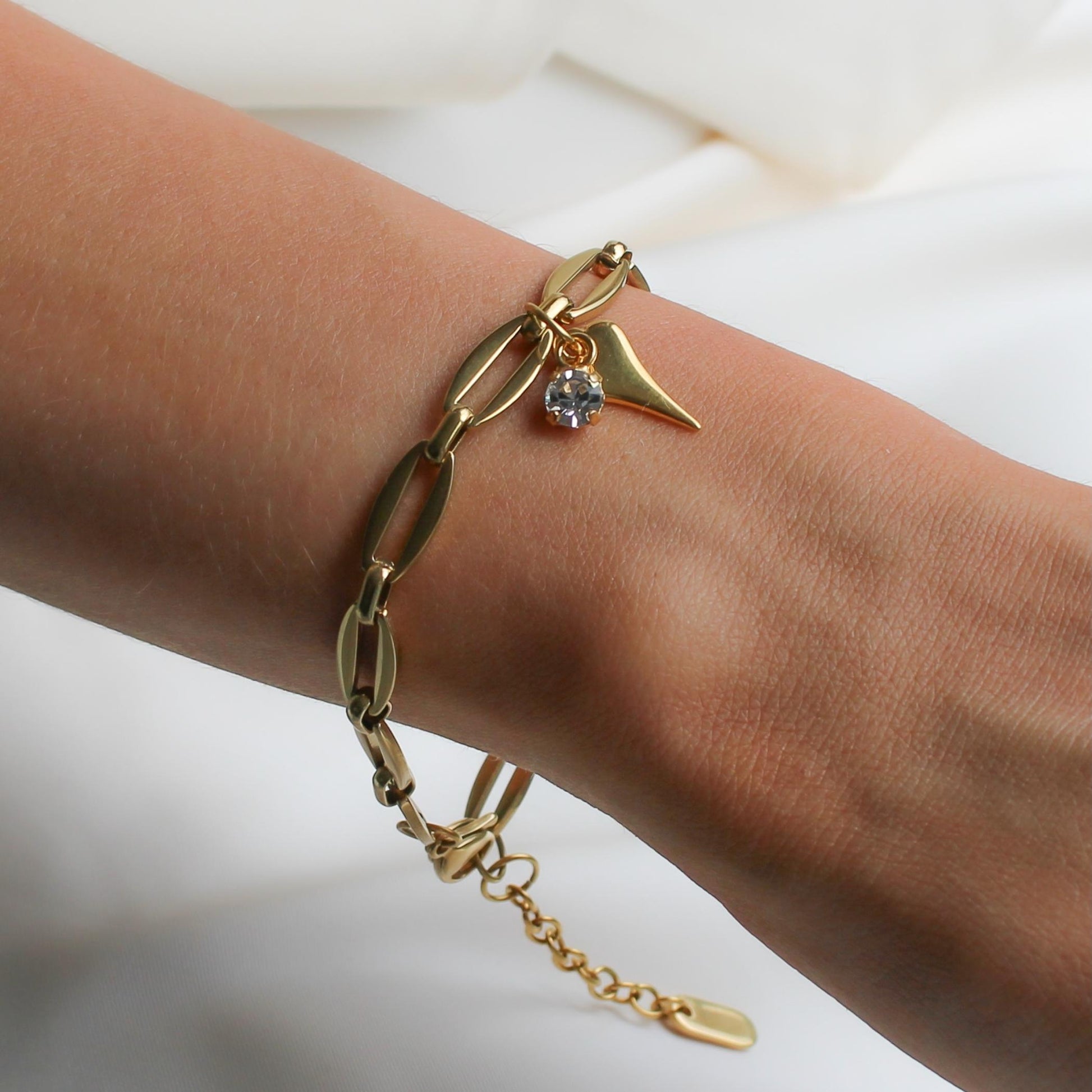 Delicate yet striking, this bracelet is a golden symbol of love and individuality. Crafted with an 18k gold-plated stainless steel long-link chain, it features a dainty hourglass-style heart charm and a sparkling crystal birthstone. Chic, sentimental, and perfect for everyday shine.