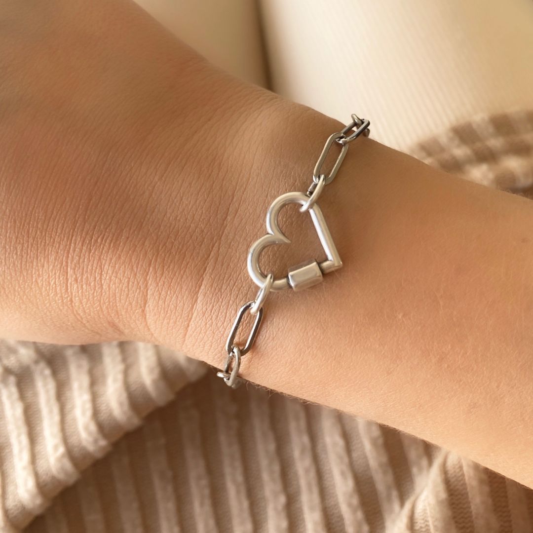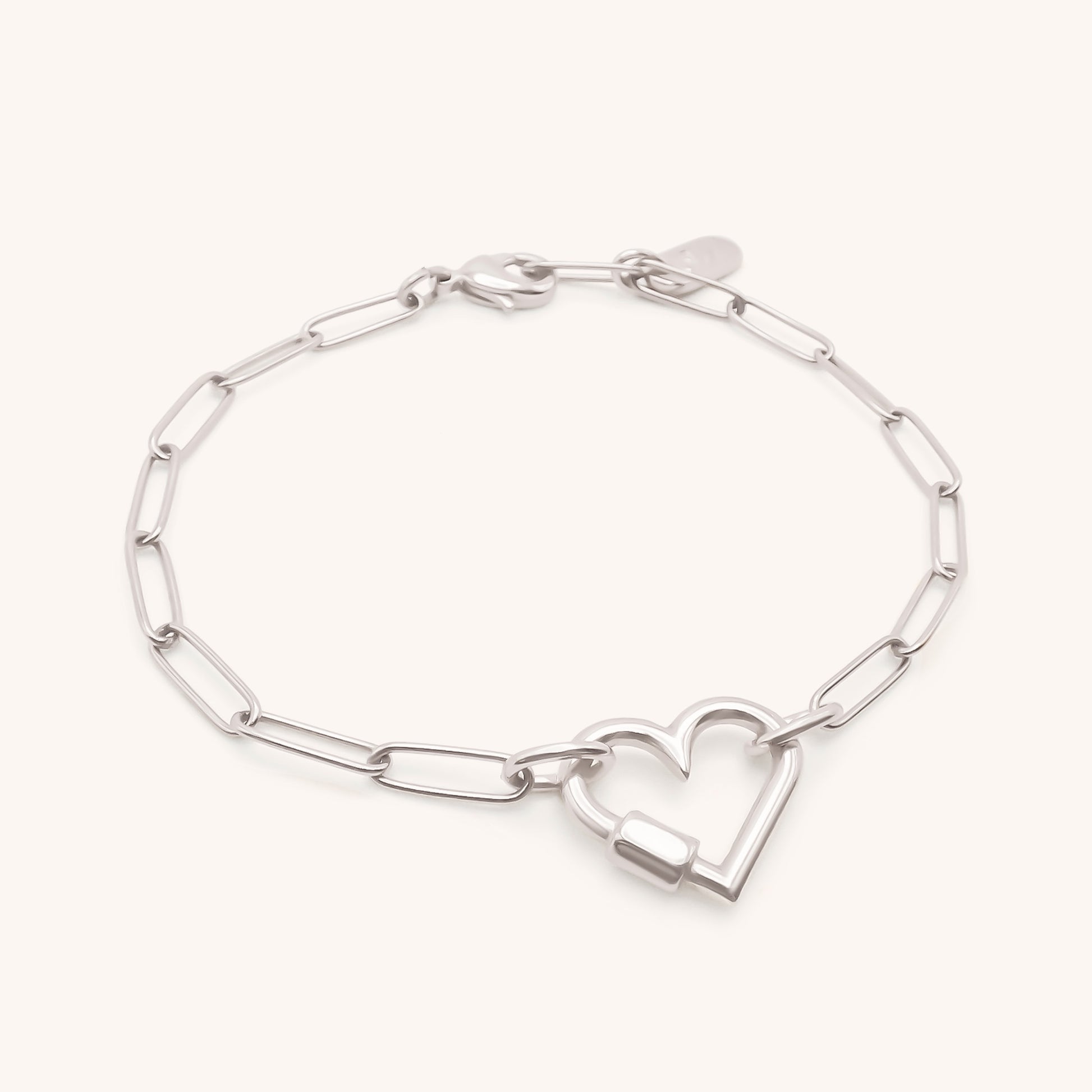 Modern romance, reimagined in silver. The Heart Lock Paperclip Bracelet is crafted from polished stainless steel for a sleek, durable shine, and finished with a silver heart lock charm for a touch of charm and sentiment. Lightweight, versatile, and made to layer—it’s an everyday favourite.
