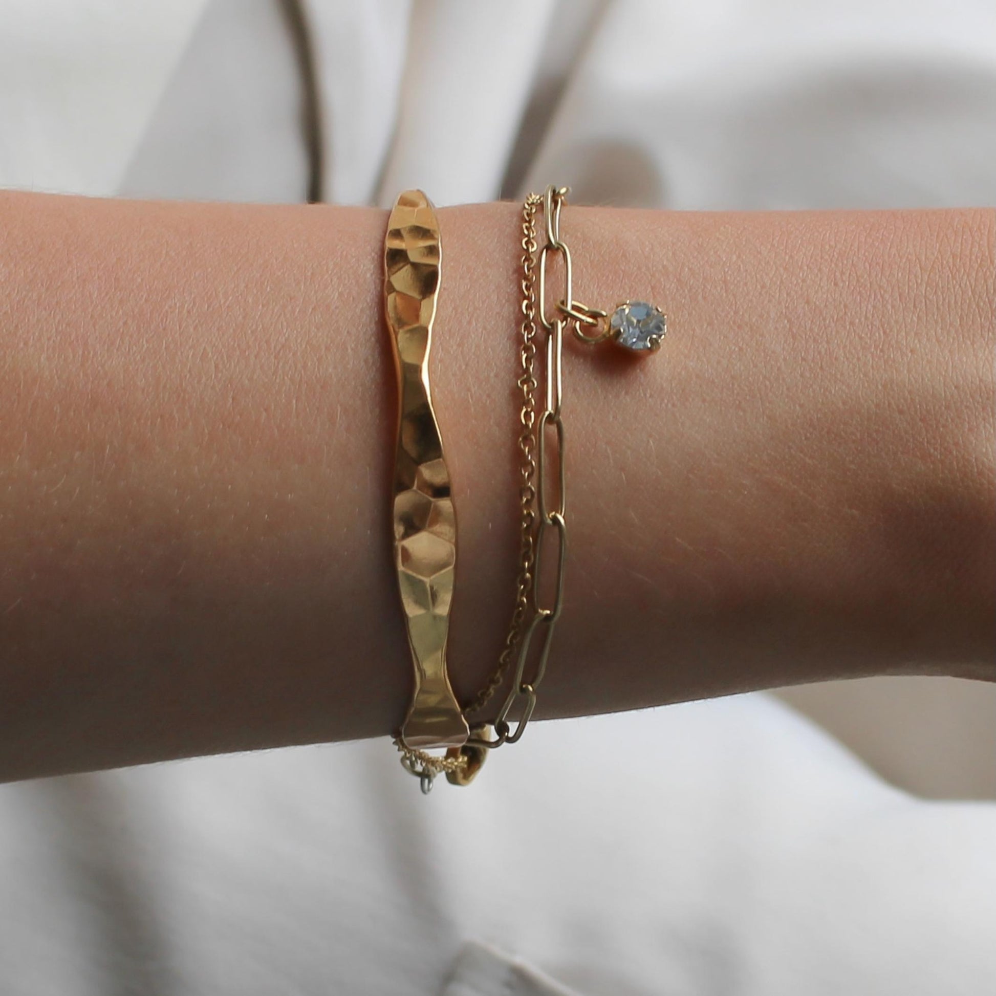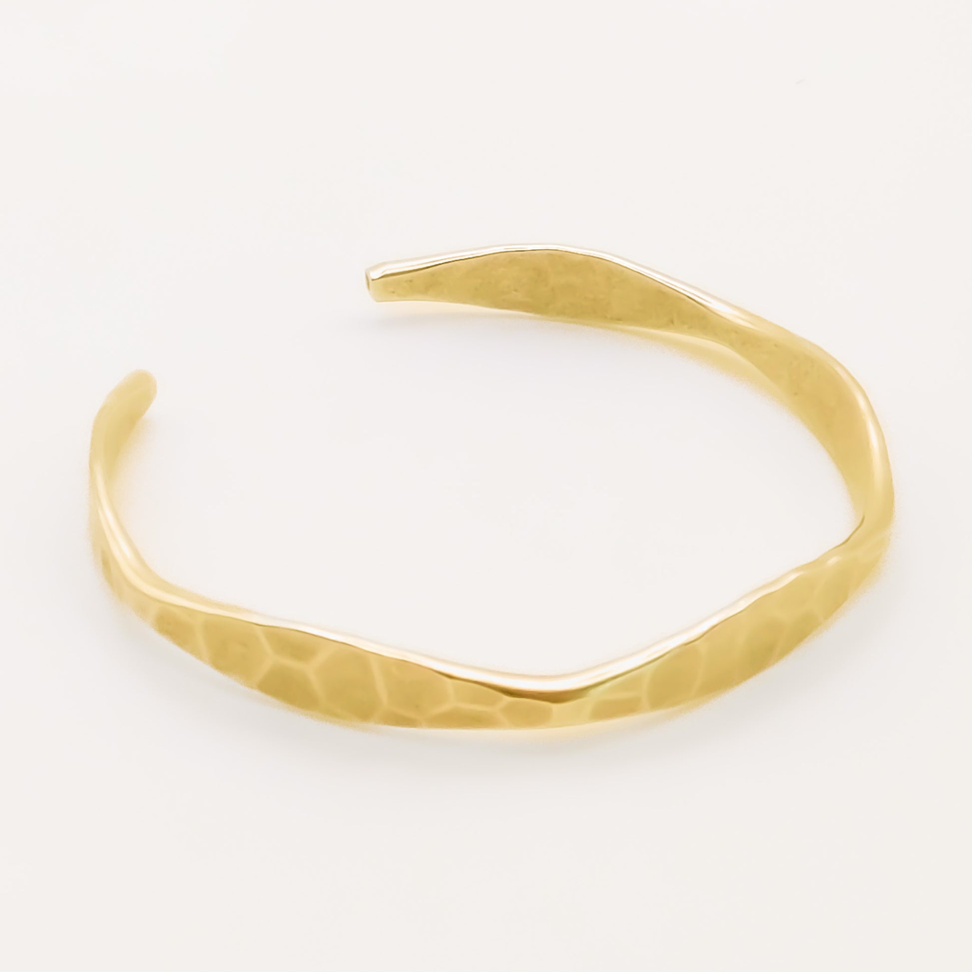 Minimalist with a twist – this open cuff bangle features a subtle hammered texture for a softly sculpted, organic look. Gold plated for a polished finish that pairs perfectly with any stack.