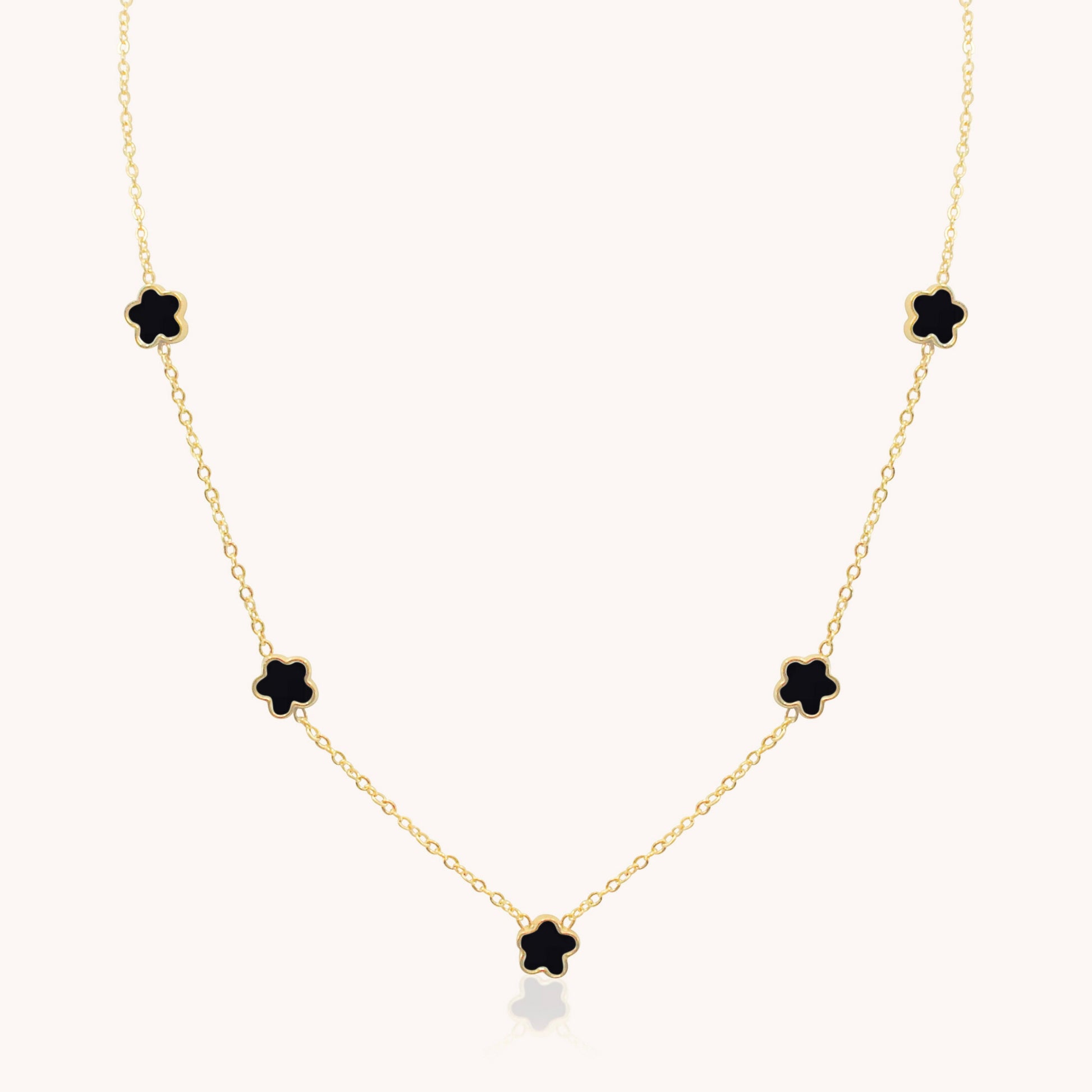 Featuring delicate black clover stations set along a fine gold chain, this timeless piece is designed for effortless layering and daily wear.