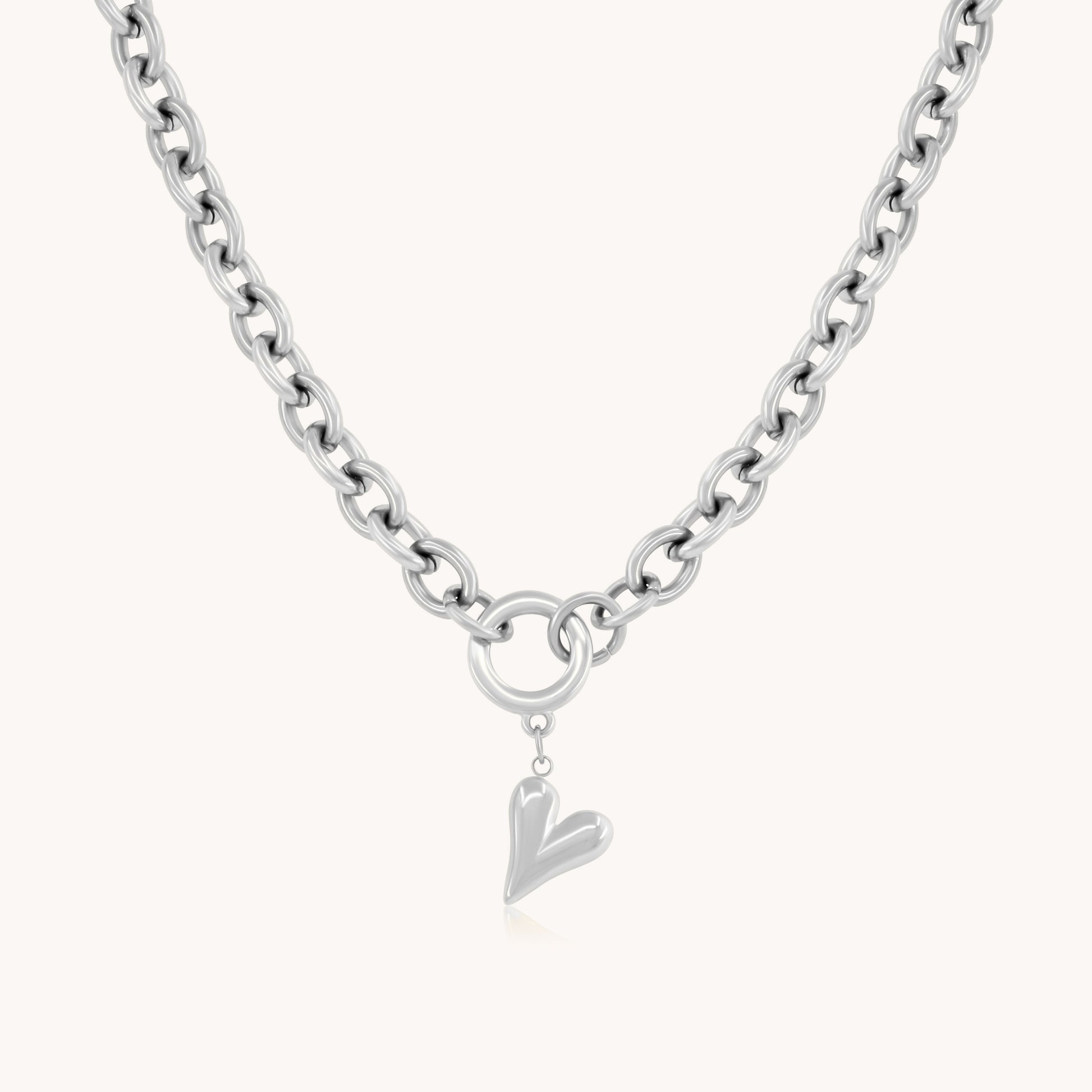 Make a statement in silver with the Celine Necklace – a chunky chain crafted from stainless steel and finished with a soft, sculpted heart charm. Sleek, strong, and ready to elevate any outfit.
