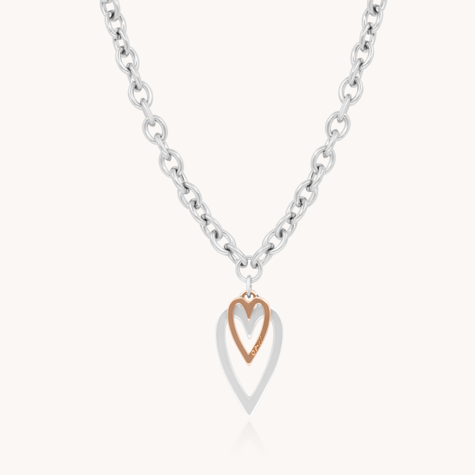 30N1235SR - Open & Mini Heart Chunky Necklace, Silver & Rose Gold