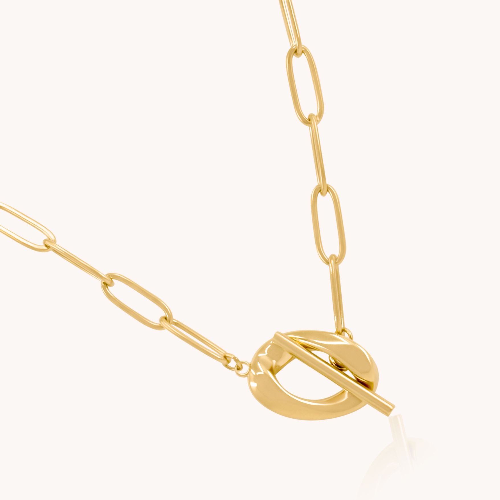 Design: A bold paperclip chain featuring a unique twisted T-bar pendant.