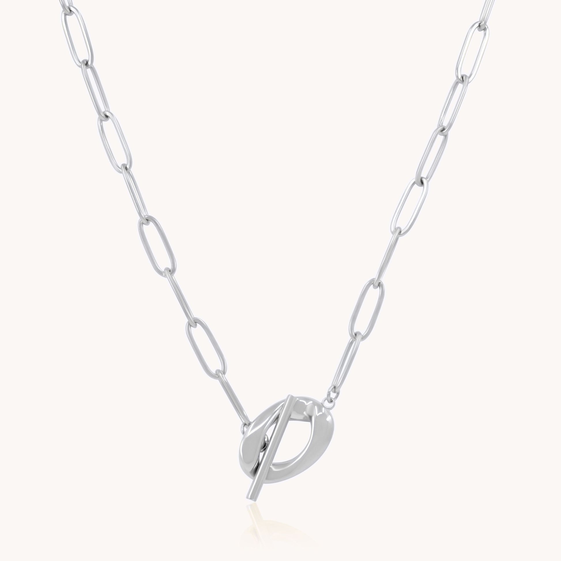 Design: A bold paperclip chain featuring a unique twisted T-bar pendant.