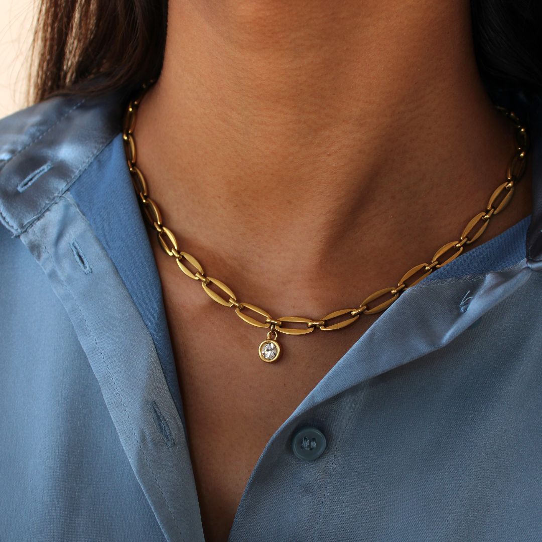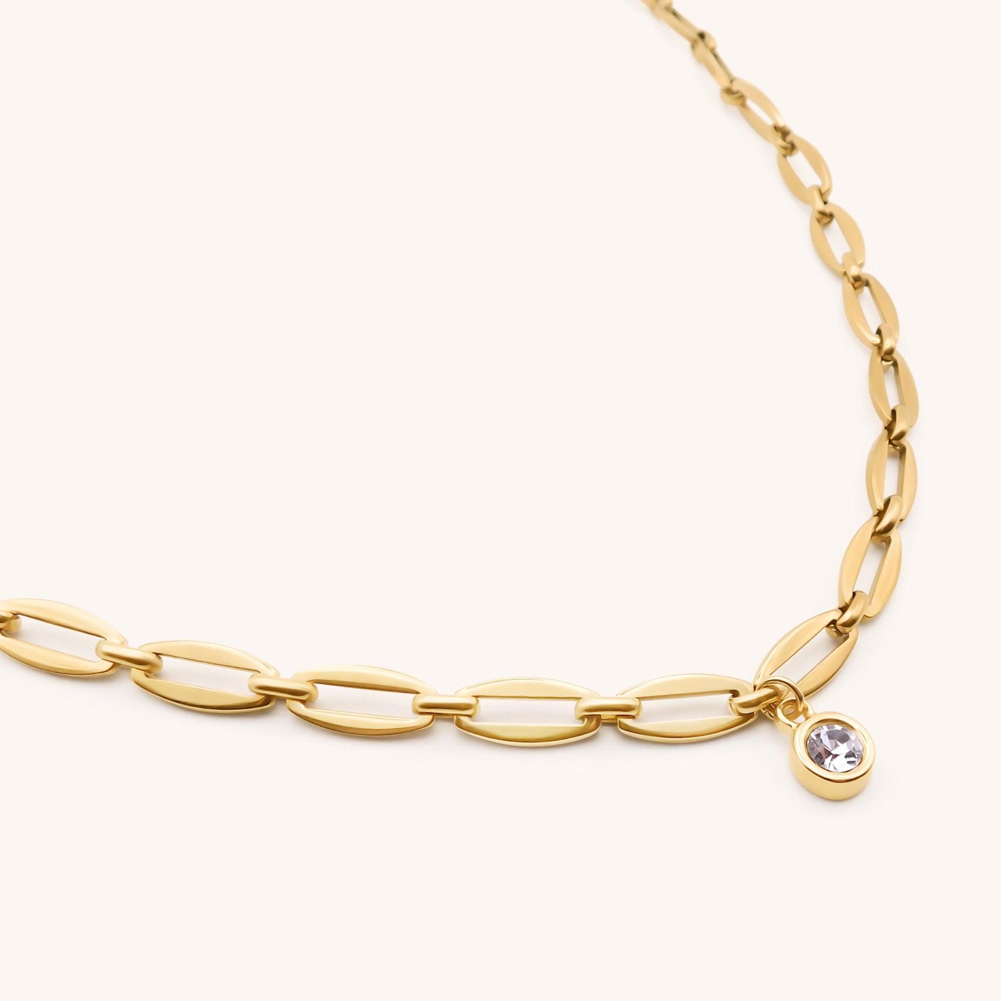 Add sparkle to any outfit. The Long Link Personalised Birthstone Necklace features a long link chain with a small crystal pendant in the centre. The crystal can be customised to any birthstone of your choice. The perfect gift for any jewellery lover.