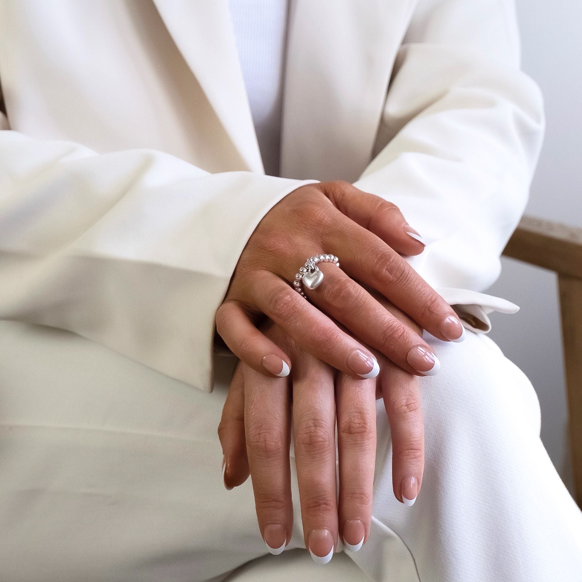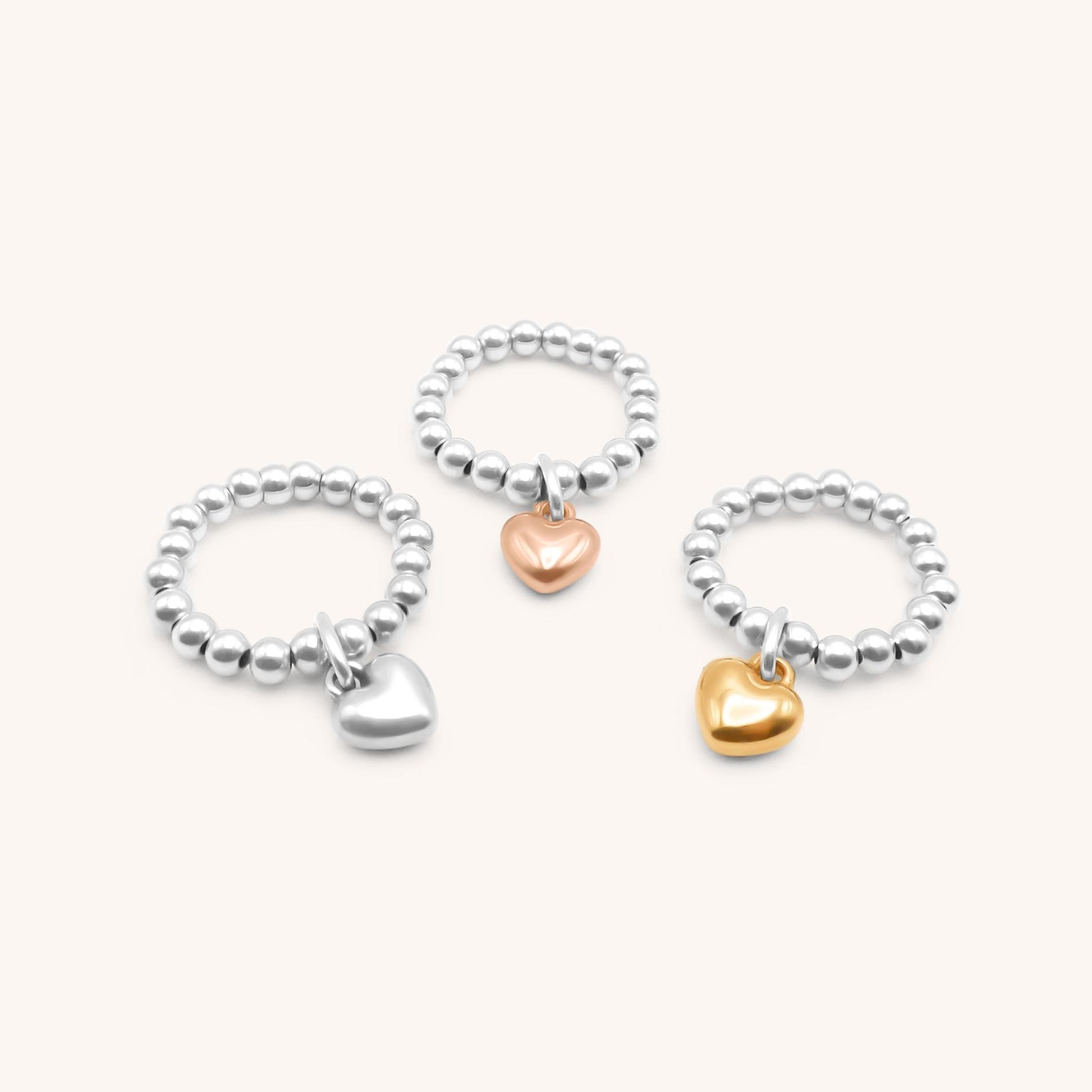 Chic and sentimental, this beaded ring is adorned with a dainty heart charm, available in silver, rose gold, or gold for a personalised touch. The elasticated design ensures a comfortable fit, making it a perfect everyday accessory.
