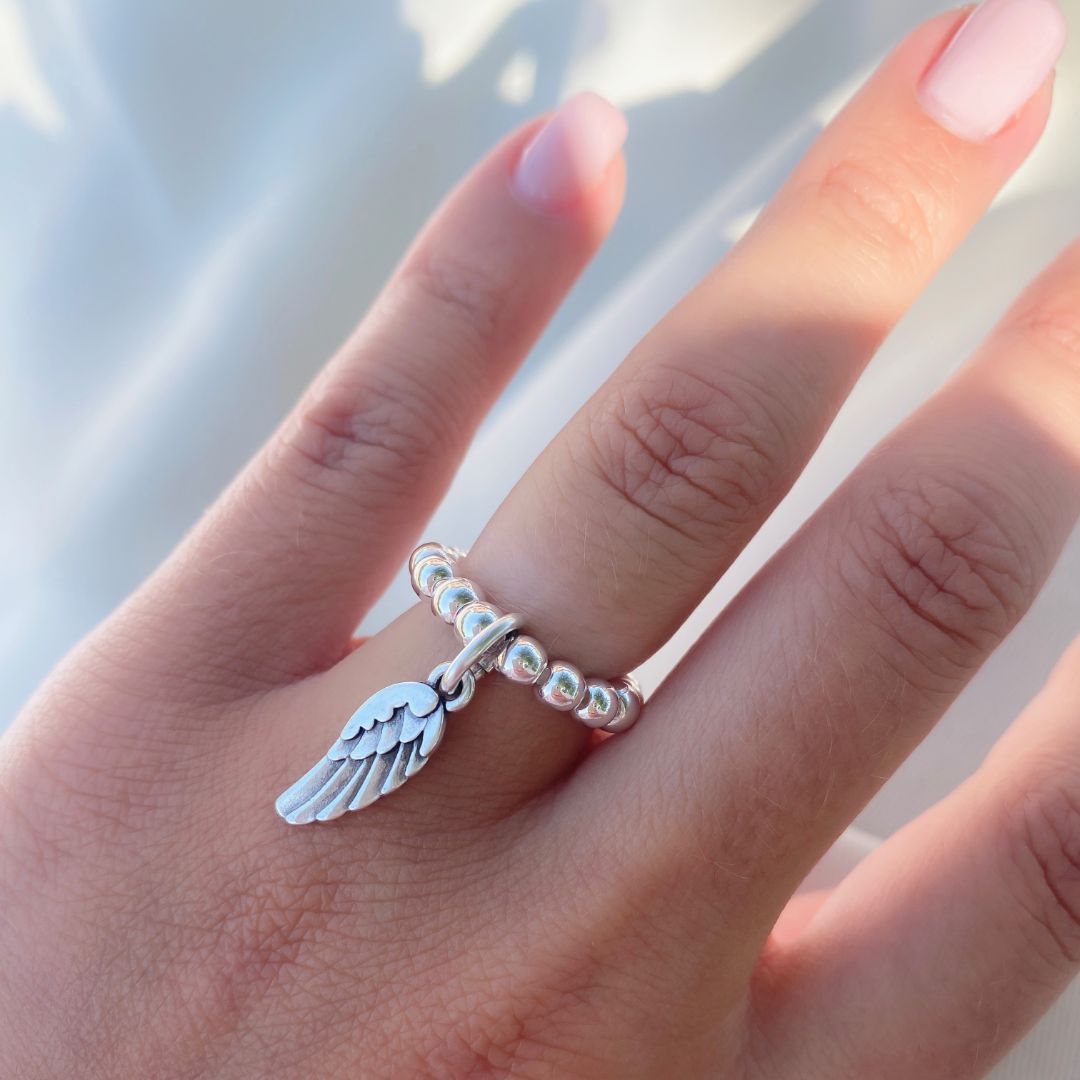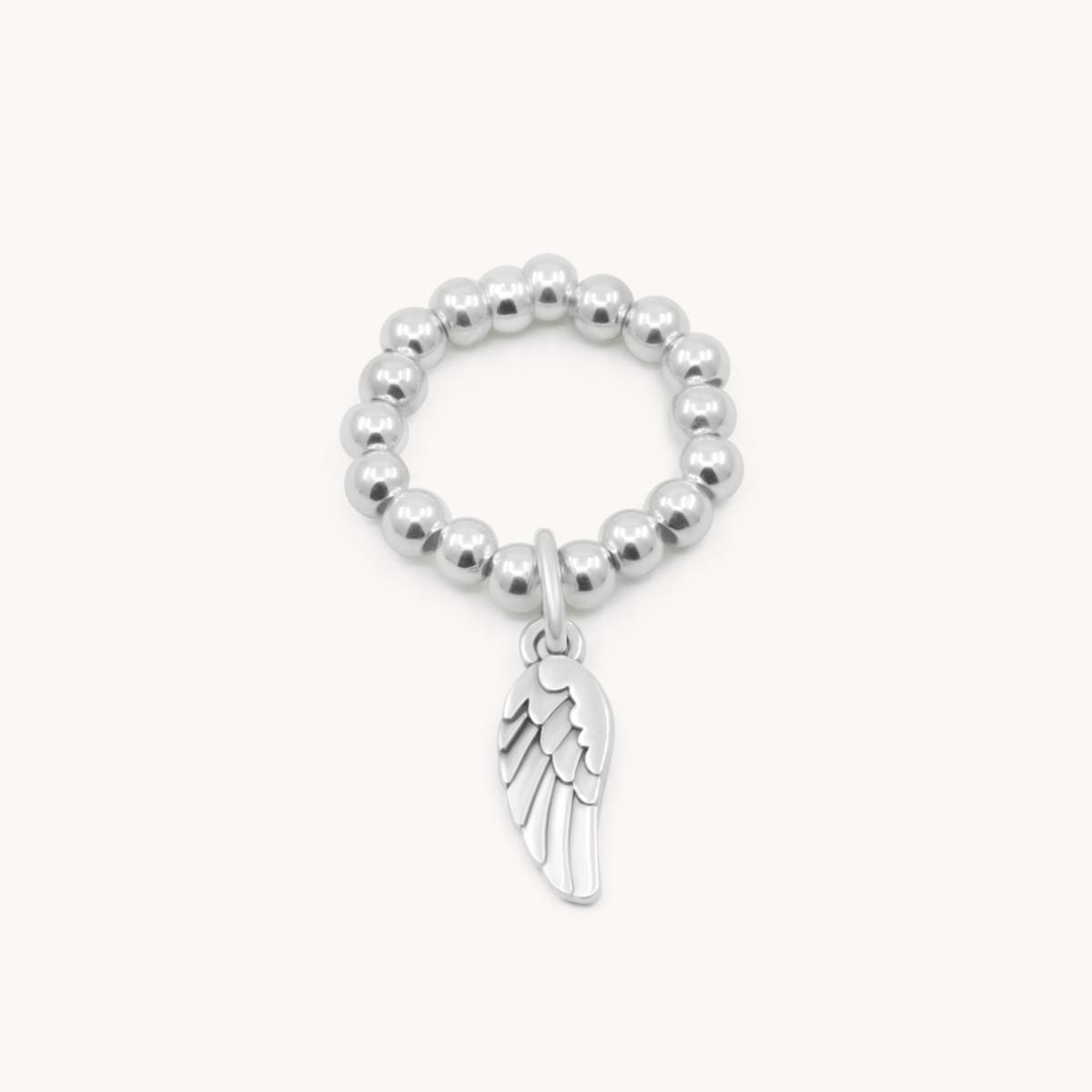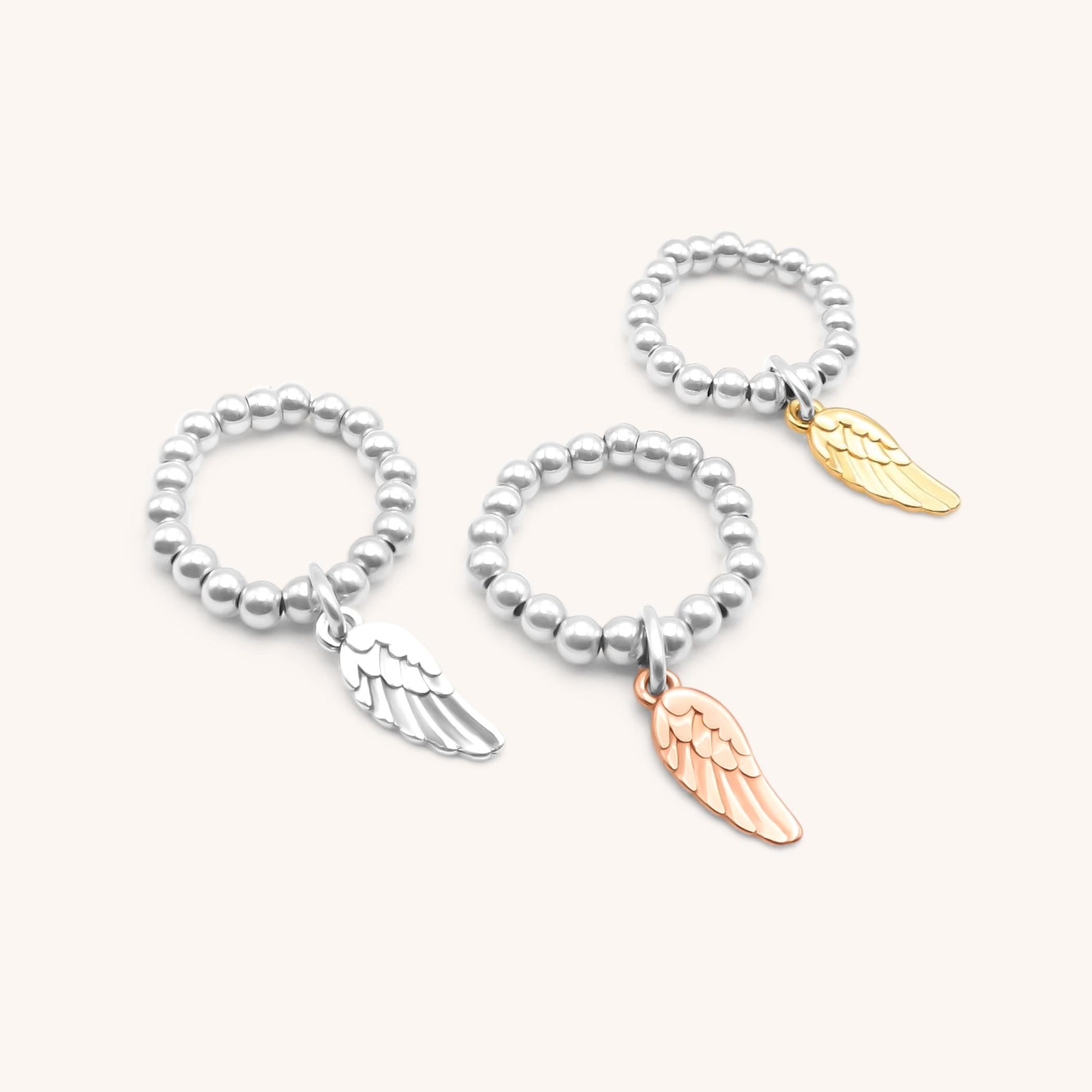 Elegant and meaningful, this silver-plated beaded ring features a delicate angel wing charm, symbolising love, guidance, and protection. A timeless piece that adds a sentimental touch to any jewellery collection, this ring is available with your choice of a silver, rose gold, or gold-plated angel wing charm for a personalised touch.