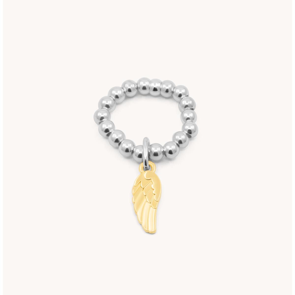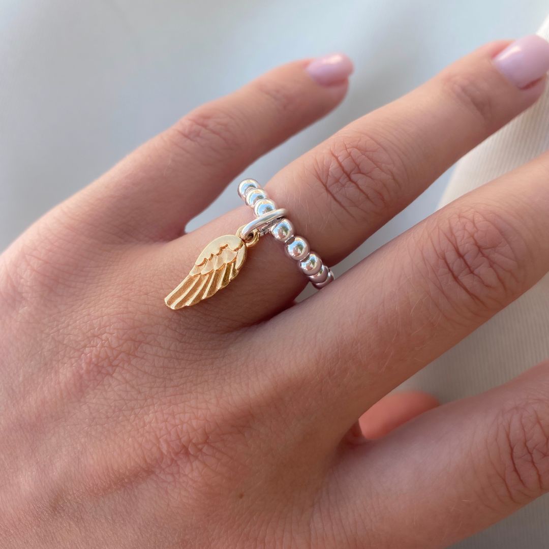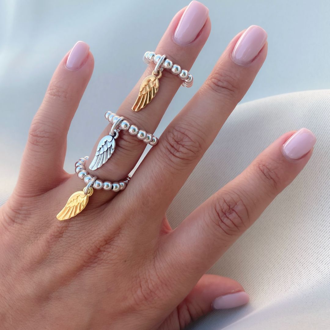 Elegant and meaningful, this silver-plated beaded ring features a delicate angel wing charm, symbolising love, guidance, and protection. A timeless piece that adds a sentimental touch to any jewellery collection, this ring is available with your choice of a silver, rose gold, or gold-plated angel wing charm for a personalised touch.