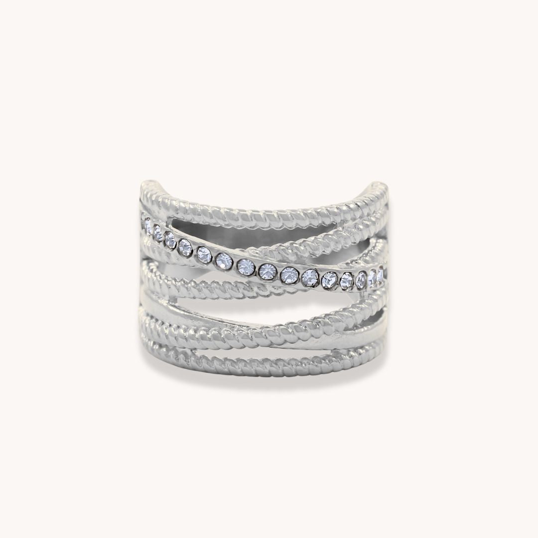 A sleek crossover ring adorned with shimmering crystals, perfect for adding a touch of elegance to any outfit.
