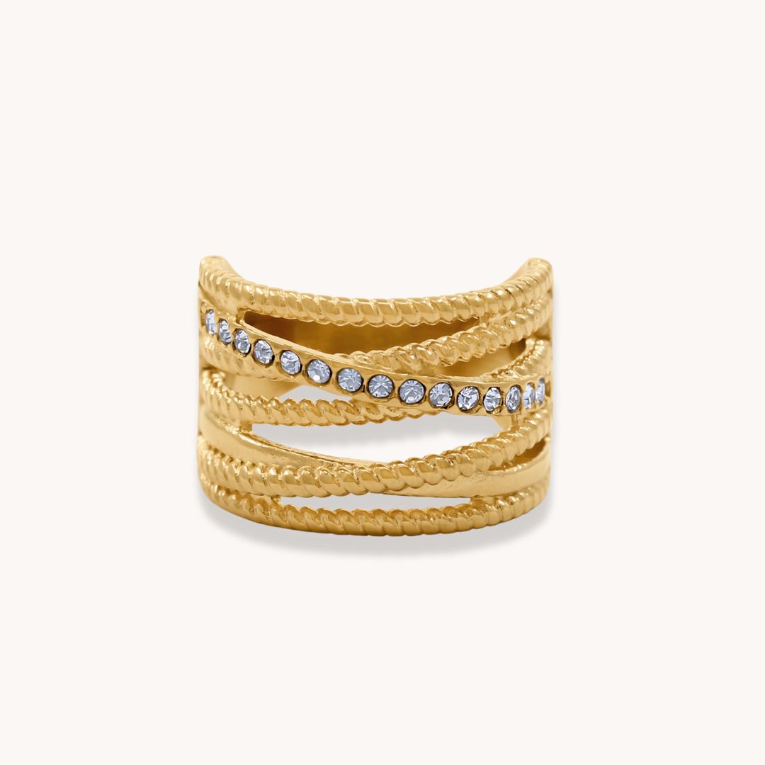 Make a statement with this bold crossover ring, featuring shimmering crystals and a striking gold-plated finish.