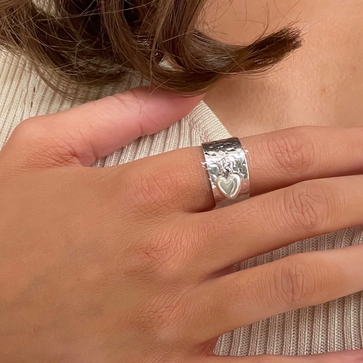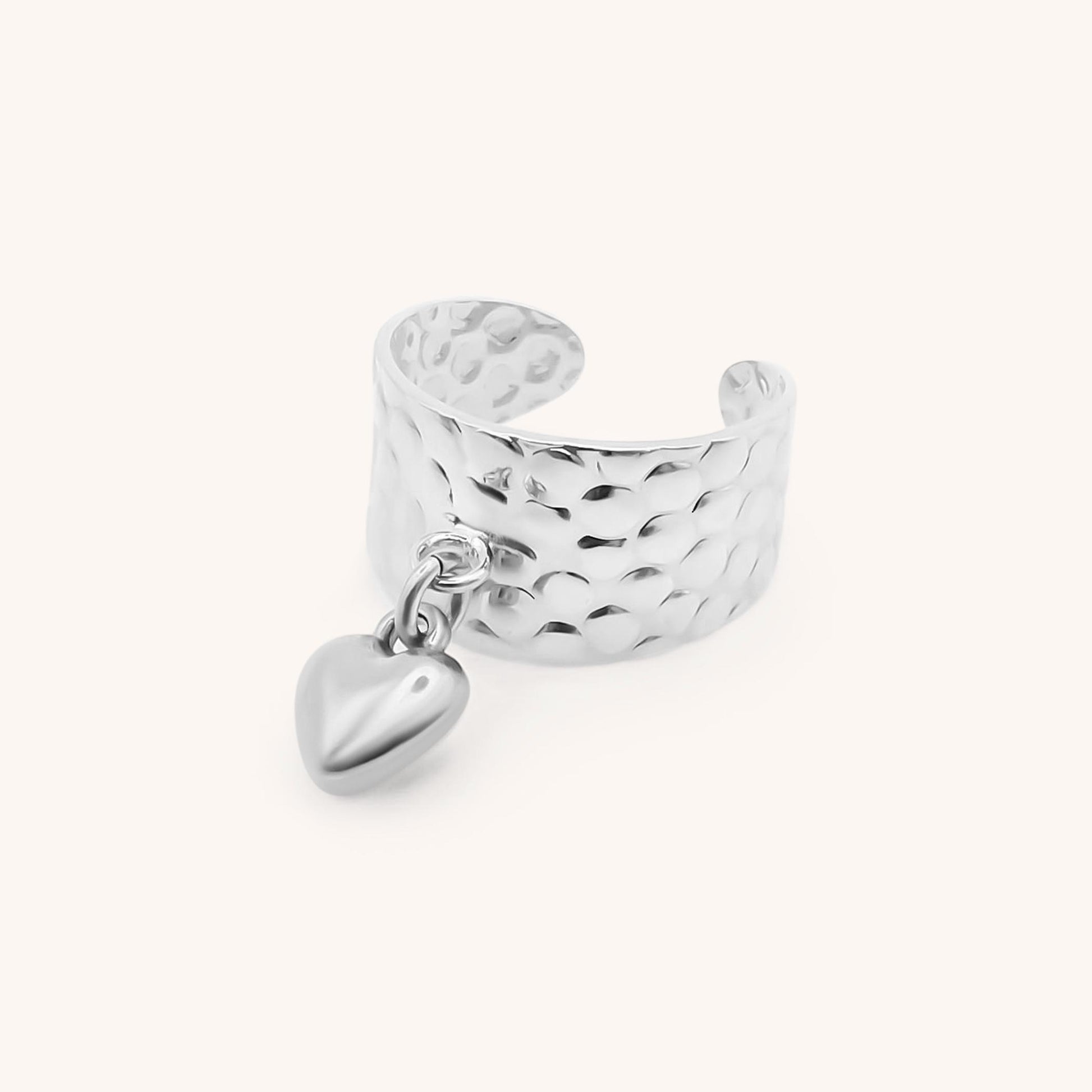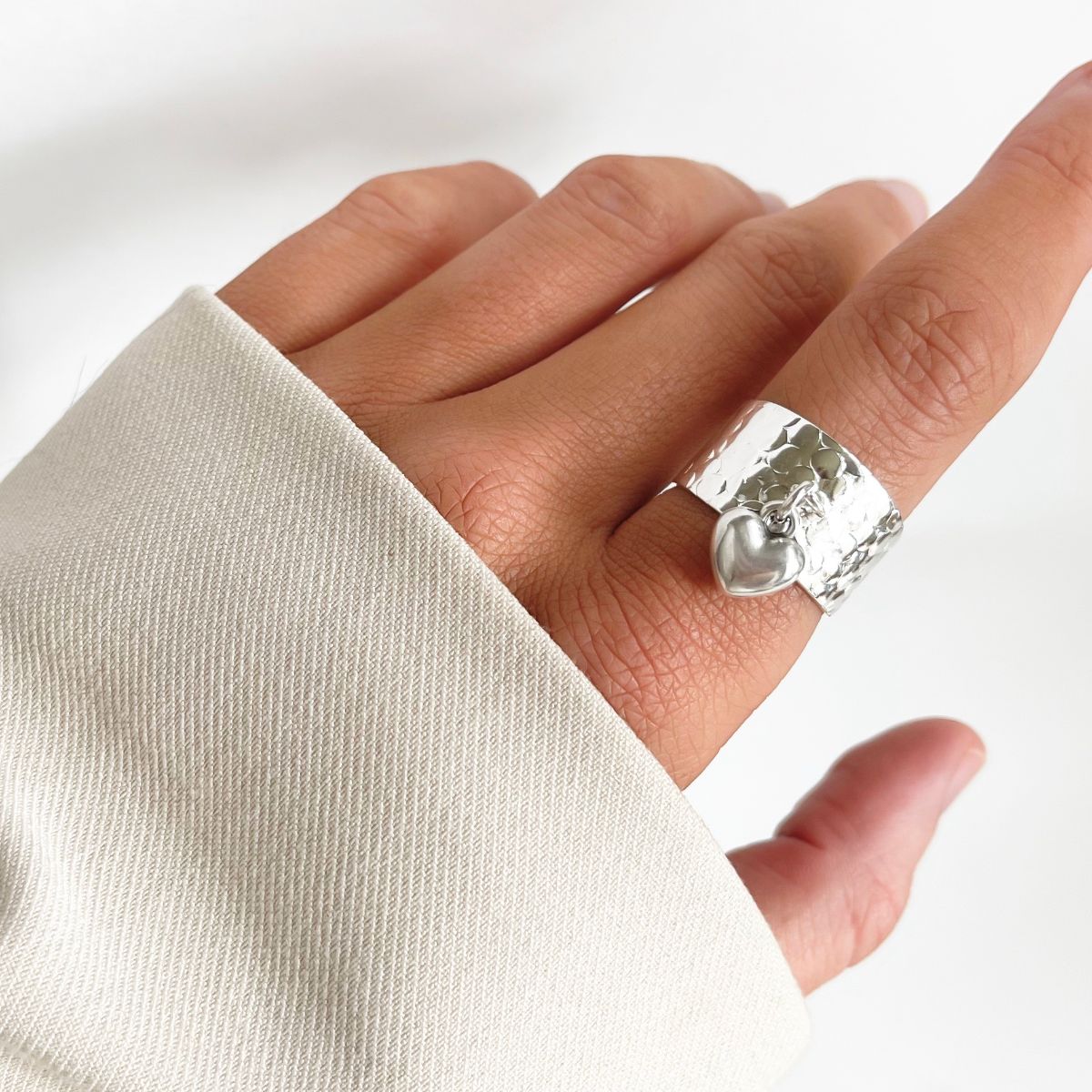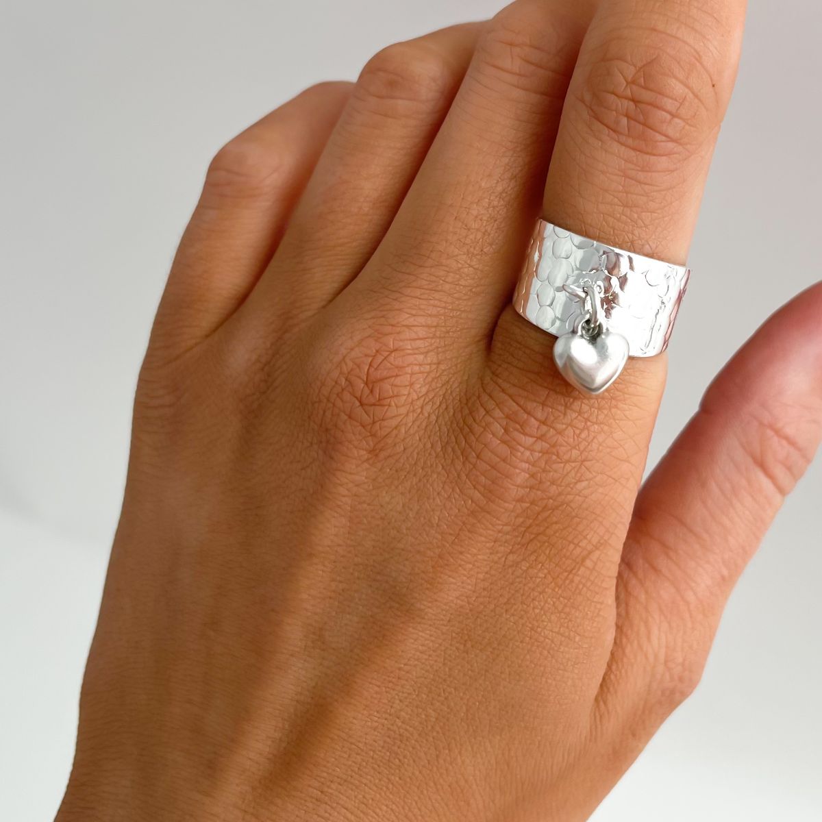 Bold and contemporary, this adjustable ring features a beautifully hammered texture that creates a stylish, handcrafted look. A delicate puffed heart charm dangles from the band, adding a touch of romance and movement to this unique design.