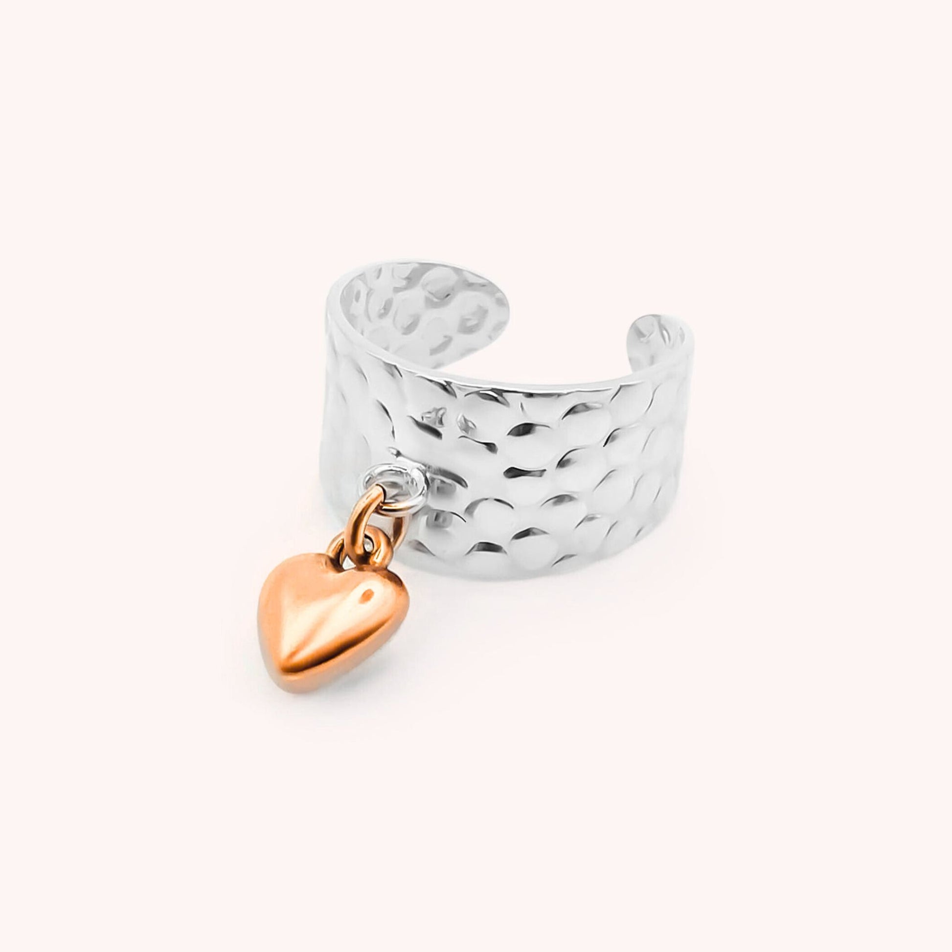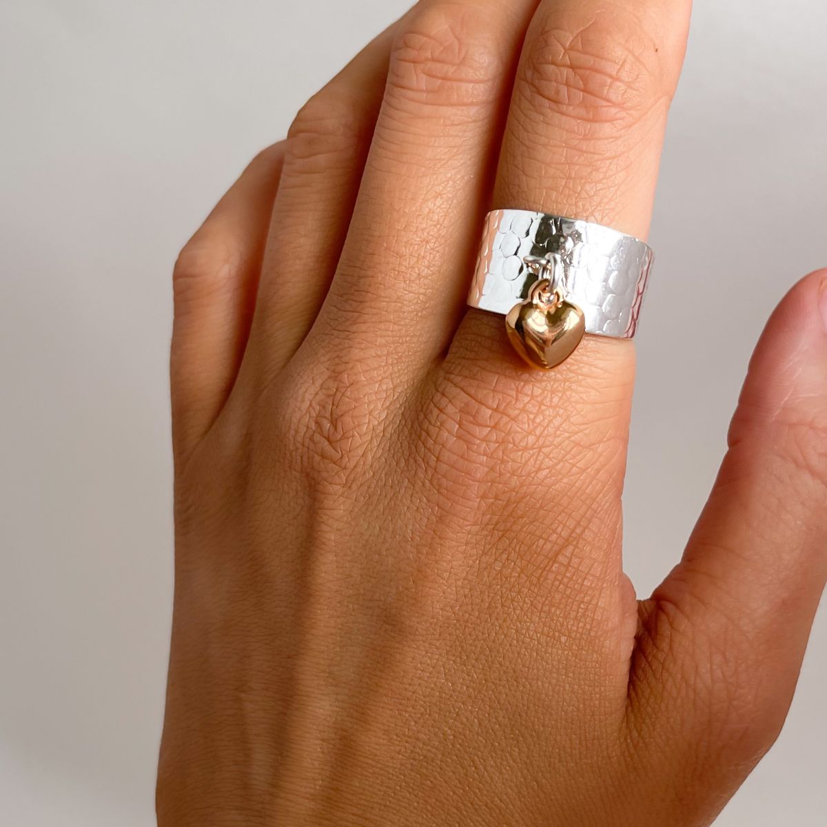 Bold and contemporary, this adjustable ring features a beautifully hammered texture that creates a stylish, handcrafted look. A delicate puffed heart charm dangles from the band, adding a touch of romance and movement to this unique design.