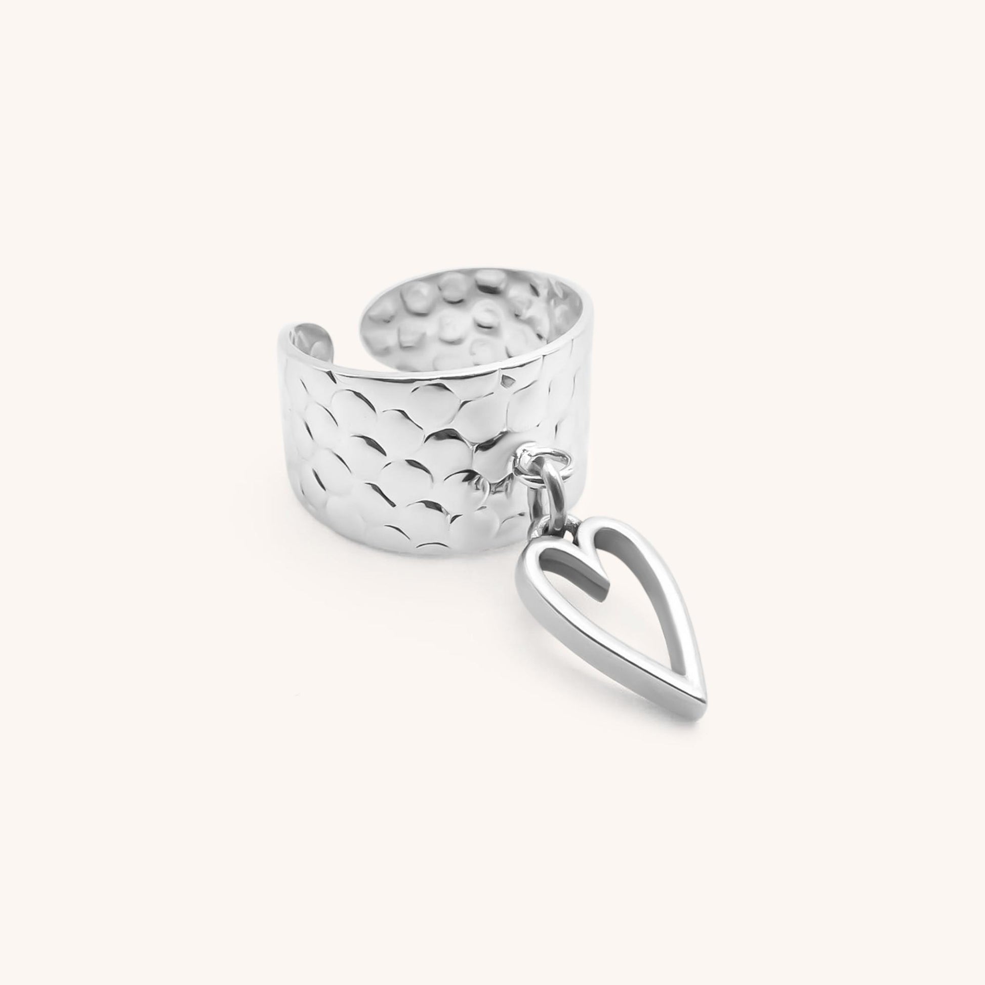 Bold yet elegant, this adjustable ring features a stunning hammered texture for a modern, handcrafted feel. A delicate silver open heart charm dangles from the band, adding a touch of movement and sophistication.