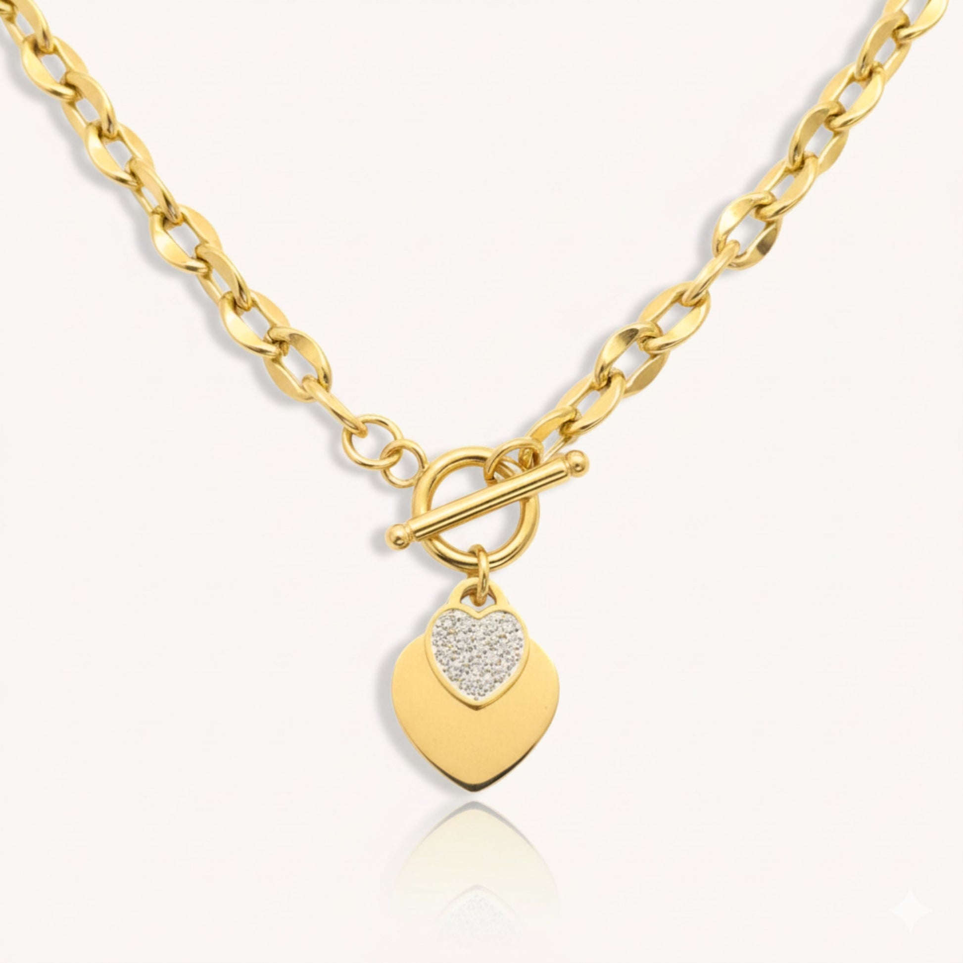 Elegant, radiant, and full of meaning. The Double Heart Toggle Necklace showcases two hearts — one sleek gold and one shimmering with pavé detail — suspended from a statement toggle clasp. Designed to capture the essence of love and make every look shine.